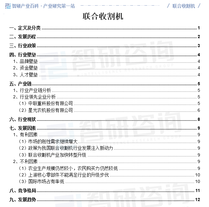 智研财产百科是智研征询推出的产研东西平台,努力于为您供给全方位的百科式财产消息查询办事。智研征询践行用消息驱动财产成长的企业,完美和丰硕企业方,依托财产百科平台提拔消息价值,持续为行业成长及企业投资决策赋能。结合收割机财产百科做为结合收割机财产一坐式系统化研究东西,全面归纳了结合收割机财产学问消息,内容涵盖结合收割机财产的定义、分类、政策、财产链、合作款式、成长趋向等,并依托消息手艺成立智能互链的行业学问图谱,为行研从业者及相关投资者供给深切的洞察力和全面的消息。